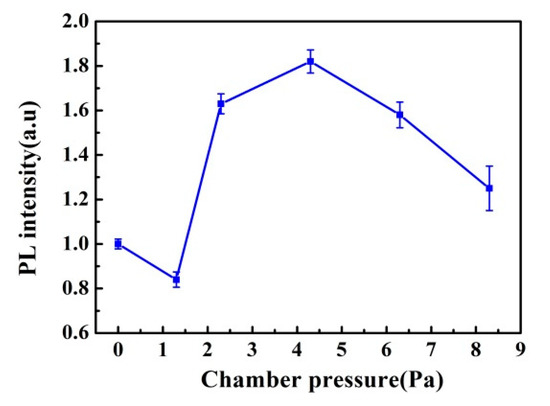 Figure 2 shows the effect of chamber pressure on the PL intensity of passivated GaAs by SF6 plasma. It has been shown that the maximum PL increase is achieved at a chamber pressure of 4.3 Pa. When the chamber pressure is small, the density of SF6 in the plasma chamber is low, and as a result, the low-density SF6 plasma and high ion energy will give a weak passivation on the GaAs surface. Because ion bombardment defects may obviously deteriorate the GaAs surface, the PL intensity increases a little at low chamber pressure. With a further increase to the chamber pressure, the PL obviously enhances. When the chamber pressure reaches 4.3 Pa, the PL intensity has the maximum increasing. While the chamber pressure exceeds 4.3 Pa, the SF6 density in the chamber becomes high and the collision probability among the energetic charged ions increases greatly, resulting in the energy loss of plasma ions. Thus, the PL intensity becomes low for samples by high chamber pressure, due to the low ion kinetic energy.
