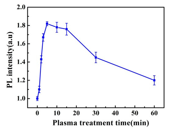 Figure 3 shows the measurement results of PL intensity versus plasma treatment time. It can be seen that when the plasma treatment time is in the range of 0–5 min, the PL intensity increases with the plasma treatment time, which means that oxides on GaAs surface can be effectively removed and the non-radiative recombination centers caused by oxide-related surface states will reduce greatly at the beginning of plasma treatment. The As–S composition may form on the GaAs surface when the plasma treatment time exceeds 5 min, although the As–S begins to decompose at 250 °C, and the intensity of PL will then tend to decrease due to the bombardment damage caused by stimulated ions.