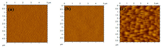The surface morphology of treated GaAs samples was measured by using AFM. Figure 4 shows the AFM images of the GaAs samples by SF6 plasma treatment with different time durations of 0 min, 5 min, and 10 min, respectively. The root mean square (RMS) roughness of the untreated GaAs surface is 0.148 nm, as shown in Figure 4a. The SF6 plasma-treated surface gives a relative low RMS roughness of 0.145 nm when the plasma treatment time is 5 min, as shown in Figure 4b. A large RMS roughness of 23.9 nm with obvious surface nanoparticles can be found when the plasma treatment time increases to 10 min, as shown in Figure 4c. This phenomenon may be caused by two reasons—firstly, the lattice mismatch of several surface compositions could have resulted in a poor surface morphology; and secondly, F− and S− ions bombarding the surface with continued passivation may eventually lead to a cluster-like migration on the GaAs surface.