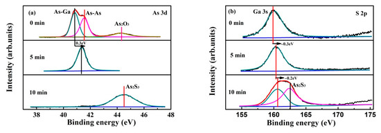 It can also be known that the poor surface morphology of the sample by 10 min treatment is caused due to the lattice mismatch of As–S and Ga–F, as shown in Figure 4c. Therefore, the GaAs surface by SF6 plasma treatment for an appropriate duration (as for 5 min) may exhibit favorable structural properties and chemical bonding conditions, which is beneficial to the subsequent device process.