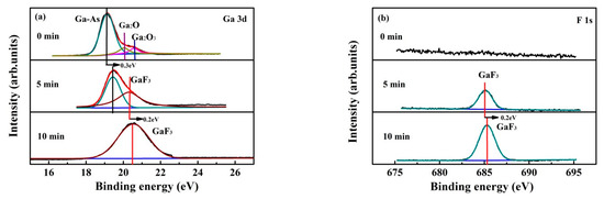 For the GaAs sample by 5 min treatment, the As–Ga and Ga–As peaks shift to 41.34 eV and 19.44 eV, respectively. A 0.3 eV blue shift of XPS peaks shows that the chemical environment of the GaAs surface is changed, due to the formation of Ga-F bonds and the passivation of the GaAs surface dangling bonds by F atoms [9,13,21]. It can be seen from Figure 5b that the Ga 3s peak also has a similar blue shift of 0.3 eV. From Figure 5b and Figure 6a,b, it is found that XPS peaks of Ga 3s and GaF3 also have a blue shift of 0.2 eV, caused by a prolonged plasma treatment for 10 min.
