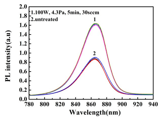 The optimized process condition for GaAs surface passivation by SF6 plasma was obtained by the experiments above, where it is shown that the maximum PL intensity is achieved at an RF power of 100 W, chamber pressure of 4.3 Pa, and treatment time of 5 min, respectively. The contrast of PL plots between passivated and untreated GaAs samples is shown in Figure 7. It can be seen that the PL intensity of the GaAs surface passivated by SF6 plasma treatment is about 1.8 times higher than that of untreated.