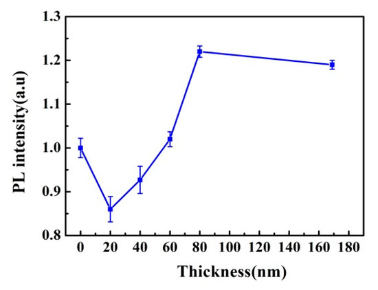 A SiO2 coating on a passivated GaAs surface was done to improve the stability of the passivation layer by RF sputtering. Samples with different thicknesses of SiO2 were prepared to test the anti-reflection effect, as shown in Figure 8. The PL intensity is only about 1.05 times higher than untreated when the SiO2 film is about 60 nm thick, which implies that a thin SiO2 coating below 60 nm has little influence on the PL intensity measurement.