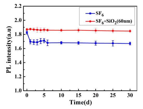 Finally, a 60 nm-thick SiO2 coating was chosen as the surface protective film to study the PL stability of passivated GaAs samples for a 30-day duration in the open air. The PLs of samples with and without SiO2 coatings were measured at room temperature. As shown in Figure 9, the PL intensity of SF6 plasma-treated GaAs samples without an SiO2 coating drops fast at about 24 h, and then tends to remain stable. The PL intensity of samples with an SiO2 coating remains nearly unchanged for the whole 30-day duration of the experiment.