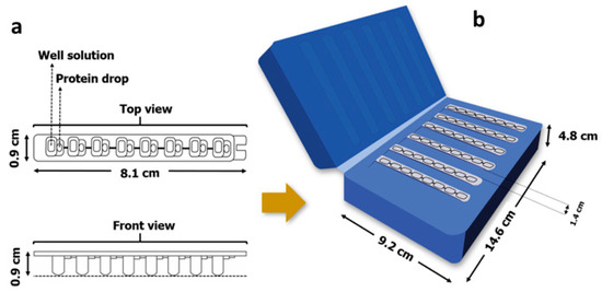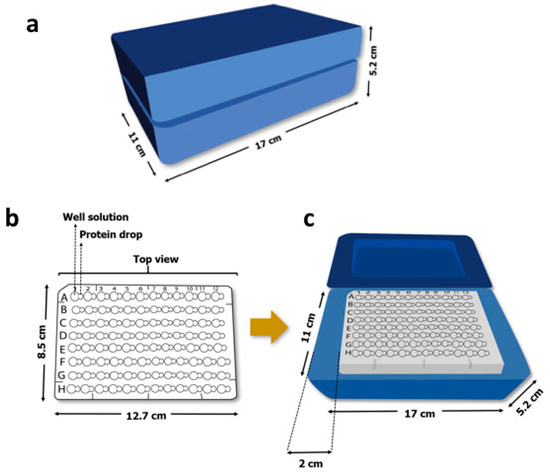 This device can support all types of the conventional plates for vapor diffusion set up in hanging and sitting-drops techniques: (a) An overview of the device and dimensions; (b) crystallization plate (96 wells) and (c) insertion of the crystallization plate.