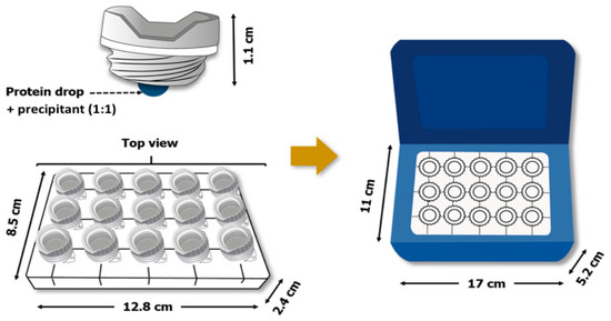 As most proteins are sensitive to changes in temperature, there is basically a specific range of very few degrees where protein crystals can keep stable and suitable for crystallization. Phase diagrams are generally very useful to improve the crystallization conditions. However, these diagrams are not always available for the majority of proteins [13,14,15,16]. This is why one of the main issues when transporting proteins to synchrotron facilities is temperature (temperature is crucial in the crystallization process). In order to keep a stable low temperature, proteins must be cryo-protected, frozen and transported in dry Dewars following the International Air Transport Association (IATA) procedures for carrying biological crystals. However, on the unfortunate occasions in which we had been revised by some poorly trained custom officers, the Dewars had been opened, and the crystal damaged due to thermal shock. The problem is obvious. In order to prevent future damage of crystals in airport revisions, we worked at designing new devices that will help us to carefully transport them to the synchrotron facilities. These are novel devices made of a patented polymer (polyolefin: US patent US 7,971,744 with a density of 32.04 kg/cm3), that can resist ranges of temperatures, from −160 °C up to 50 °C, without altering the quality of the protein crystals transported inside. Figure 1, Figure 2 and Figure 3 show the dimensions of these new devices, which consisted of a rectangular piece of this porous polyolefin with some perforations inside adapted to the conventional and commercially available crystallization plates. The protein crystals, once inside the polymeric devices, are then suitable to be transported even in a regular suitcase without problem. We have already tested these devices by crystallizing some model proteins and transporting them to the synchrotron in terms of checking their efficiency as thermal protectors. The beamline XRD1 of ELETTRA synchrotron located in Trieste Italy, was the facility where the X-ray data collection was performed [37]. Figure 1 shows the first thermal protection device applicable to the 96 well-plates, which are commercially available.