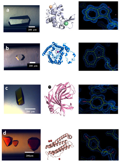 The following set of pictures (Figure 4) shows the best crystallization results of the model proteins transported in the aforementioned thermal protection devices (as shown in the data collection and refinement statistics of Table 2). The high-resolution electron-density map shown for the aromatic residues proves that the crystals diffracted the X-rays at very high resolution. Additionally, it can be seen that all protein crystals arrived at the synchrotron facilities without crystal structure damage.