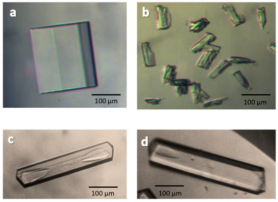 - Lorber, B.; Sauter, C.; Theobald-Dietrich, A.; Moreno, A.; Schellenberger, P.; Robert, M.C.; Capelle, B.; Sanglier, S.; Potier, N.; Giege, R. Crystal growth of proteins, nucleic acids, and viruses in gels. Prog. Biophys. Mol. Biol. 2009, 101, 13–25. [Google Scholar] [CrossRef] [PubMed]