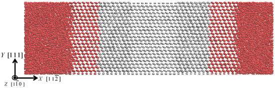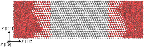 The setup of the molecular dynamics simulation cell of silicon crystal growth has been described previously [6], and for readers’ convenience it is explained briefly here. As shown in Figure 1, the middle part of the cell with atoms in light gray represents the crystal “seeds”, and the left and right disordered parts with atoms in dark color (red) represent the silicon melt, which was obtained through a simulation of melting silicon crystal. The ordered part between the seed and the melt is the crystal grown in the simulation. The atoms from the seed and the melt are kept recorded, with their color unchanged. Due to the high temperature of the system, it is not surprising to see that some of the atoms from the “seed” dissolve into the melt, and some of the atoms from the melt diffuse into the “seed”.