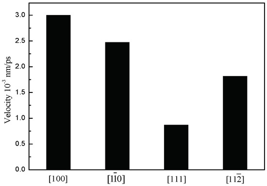 Periodic boundary conditions are applied in each dimension of the cell. The growth direction is set as the X direction of the coordinate system, as shown in Figure 1, which is a <112> direction. The other three different simulation cells, with X being an <100>, <110> or <111> direction of the crystal seed, were also set accordingly. Their initial melt parts are all set at 12 nm long on each side along the X axis. The sizes of the crystal seeds are set at about 16 nm along the X axis, and about 12 nm along Y and Z axis, for the four different simulation cells, with the detailed size satisfying the requirement of periodic borders. The cell sizes were verified to be acceptable for the respective study, by a trial simulation with a cell twice large in each dimension, and it was found that this yielded results similar to that by the simulation with the cell of the present sizes.
