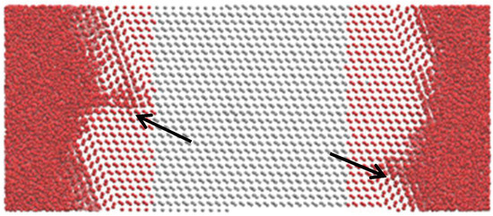 A snapshot of an example of dislocation formation in a strain-free <112> growth, at 1000 ps. The arrows indicate two locations of the dislocations formed.
