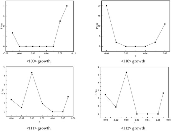 Figure 4 also shows that the growths under applied strain/stress conditions behave very differently in the formation of dislocations. In the growths along <111> and <112> directions, strains within a certain range, either tensile (ε > 0) or compressive (ε < 0), depress the dislocation formation, although strains beyond the range finally lead to an increase of the probability of dislocation formation. In the <100> and <110> growths, strains over a certain range also increase the probability of dislocation formation. It is noticed that the strain effect is not symmetrical about the 0 strain, with compressive strain being more effective than tensile strain in inducing dislocation formation.