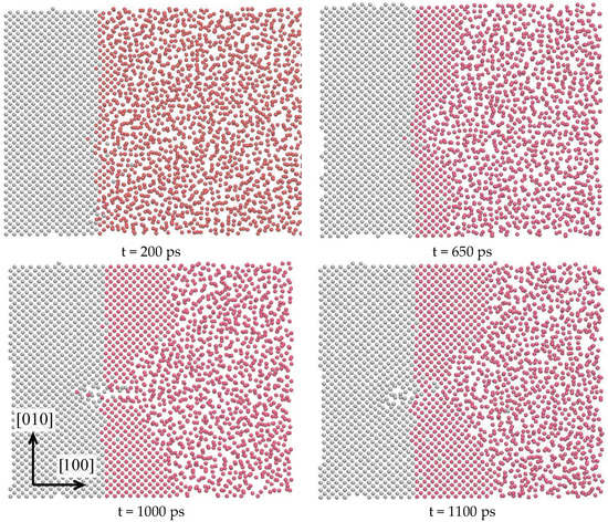 - Nishihira, K.; Motooka, T. Molecular-dynamics simulations of crystal growth from melted Si: Self-interstitial formation and migration. Phys. Rev. B 2002, 66, 233310. [Google Scholar] [CrossRef]
