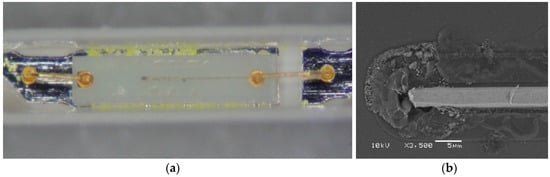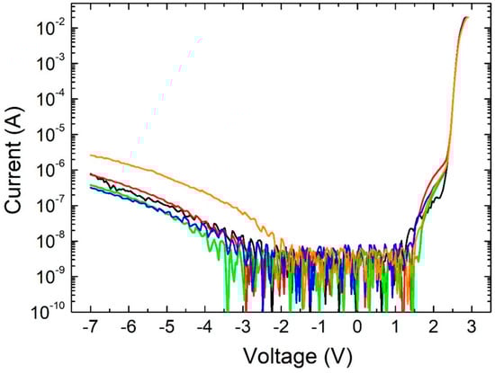 The current–voltage curves when the ESD process was increased to 4 kV are shown in Figure 3. It was found that about 60% of LED chips short-circuited. However, the results were divided into two extreme cases. One case passed and did not have any faults on the current–voltage curves. The other failed and are represented as a short in the p-n junction case. In general, the higher probability is that it happened at the p-electrode terminal end as shown in Figure 1b. However, it is not so easy to find the middle case which is not so healthy on current–voltage curve, but where the illumination power and turn-on voltage are still normal. In our actual production case, the probability was estimated about at parts-per-million level. Although we may perform the full current–voltage scan with the bias range of −7 V to 3 V for all samples, it wastes too much time in mass production and seems to violate the time budget.