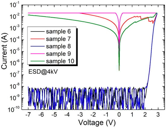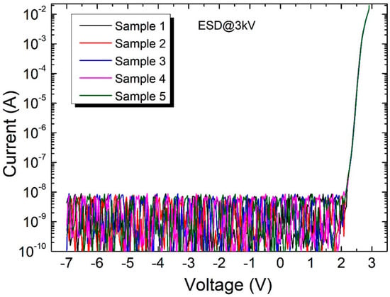 Current–voltage curves after an ESD bias of 4 kV. Three samples were failed, and two samples were passed.