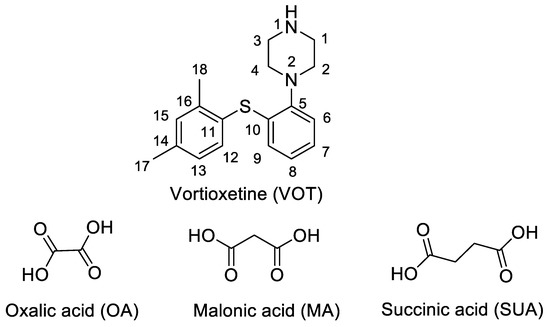 Vortioxetine (VOT) is a novel antidepressant, an active pharmaceutical ingredient, which is used for the treatment of major depressive disorder [16]. VOT is a poorly water-soluble drug (0.04 mg mL−1) [17], and it was commercialized in a hydrobromide salt form. To date, there are several literatures [17,18,19,20] on 14 salts of VOT (with hydrobromic acid, hydrochloric acid, p-hydroxybenzoic acid, saccharin, l-aspartic acid, p-toluic acid, p-nitrobenzoic acid, p-aminobenzoic acid, salicylic acid, 5-fluorouracil, and (p-nitrophenyl)-acetic acid). Of these, the salt with L-aspartic acid could remarkably increase the solubility of VOT, which indicates that dicarboxylic acids might have a huge potential in improving the solubility of VOT. The purpose of this study was to improve the aqueous solubility of the drug via crystallization with dicarboxylic acids. In this paper, three C2-C4 straight-chain dicarboxylic acid salt hydrates of vortioxetine were obtained by slow solvent evaporation crystallization with dicarboxylic acid (oxalic acid, malonic acid and succinic acid). Among these salts, succinic acid is a GRAS (Generally Regarded as Safe) compound. The chemical structures of VOT and coformers are displayed in Figure 1.
