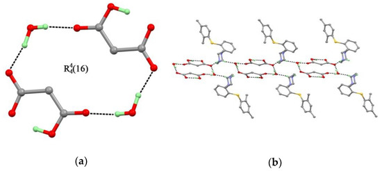 The VOT-SUA-H2O salt crystallized in the monoclinic C2/c space group with one protonated VOT cation, one deprotonated SUA anion, and one half water molecule in the asymmetric unit. In the molecular structure, two SUA anions and one water molecule form a two-dimensional sheet-like structure through O5-H5A···O4 and O2-H2···O3 hydrogen bonds (Figure 4a), and these sheet-like structures are connected to the corresponding VOT cations via N1+-H1A···O1 and N1+-H1B···O5 hydrogen bonds, forming a (22) motif (Figure 4b).
