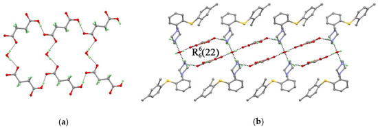 The VOT-MA-H2O salt crystallized in the monoclinic P21/n space group with one protonated VOT cation, one deprotonated MA anion, and one water molecule in the asymmetric unit. In the molecular structure, two MA anions and two water molecules form a tetrameric (16) motif through O5-H5A···O1 and O5-H5B···O2 hydrogen bonds (Figure 3a). These tetramers are connected to four adjacent VOT cations via N1+-H1A···O5 and N1+-H1B···O2 hydrogen bonds, forming a two-dimensional supramolecular network (Figure 3b).