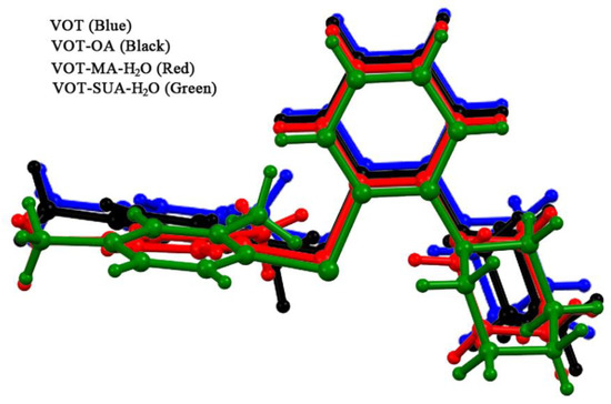 Overlay of VOT molecules extracted from crystal structures. Color codes: blue = VOT; black = VOT-OA (1:1); red = VOT-MA-H2O (1:1:1); green = VOT-SUA-H2O (1:1:0.5).