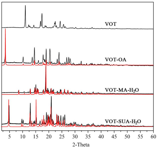 Experimental (black) and simulated (red) powder X-ray diffraction patterns for VOT, VOT-OA, VOT-MA-H2O, and VOT-SUA-H2O salt.
