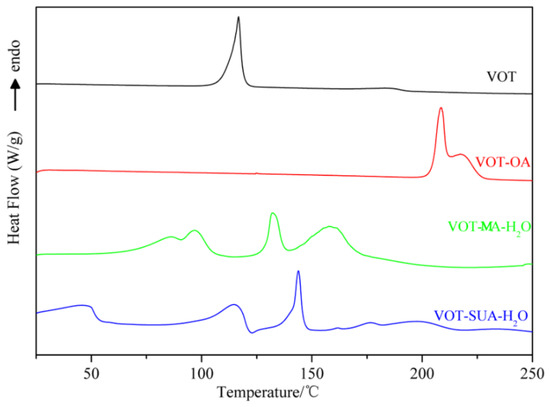 DSC thermograms of VOT, VOT-OA, VOT-MA-H2O, and VOT-SUA-H2O salt.