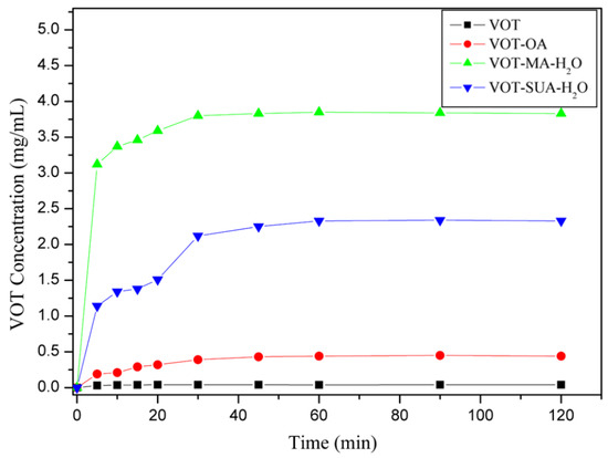 The powder dissolution profiles of VOT, VOT-OA, VOT-MA-H2O, and VOT-SUA-H2O salts in water are shown in Figure 8. The maximum values of VOT concentrations of VOT-OA, VOT-MA-H2O, and VOT-SUA-H2O salts were approximately 11, 104, and 58 times larger than that of pure VOT, respectively. Further, the powder dissolution studied indicates that the VOT-MA-H2O and VOT-SUA-H2O salts have a better powder dissolution property that can be a promising drug candidate.