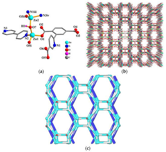 Compound 2 also features a 3D metal-organic framework which, in contrast to 1, is driven by μ4-cpta3− spacers along with additional μ-OH− and µ-4,4′-bipy linkers. The asymmetric unit of 2 bears two crystallographically unique Zn(II) atoms, a μ4-cpta3− block, a μ-OH− group, a µ-4,4′-bipy ligand, and six water molecules of crystallization (Figure 2a and Figure S2). Both Zn atoms are four-coordinate and display distorted tetrahedral {ZnNO3} or {ZnN2O2} geometries. Zn1 center is bound by two O atoms from two µ4-cpta3− blocks, a µ-OH− linker, and an N donor from the µ-4,4′-bipy moiety. Zn2 atom is coordinated by one O and one N atom from two different µ4-cpta3− blocks, one µ-OH− group, and one N atom from the µ-4,4′-bipy ligand. The Zn–O [1.936(5)–1.977(5) Å] and Zn–N [2.030(6)–2.050(6) Å] bond lengths are within typical values for related Zn(II) derivatives [16,24,25]. In 2, the cpta3− block acts a μ4-N,O3-spacer (mode III, Scheme 1) and its COO− groups adopt a monodentate mode; a dihedral angle between the aromatic rings in cpta3− is 70.81°. One µ-OH− linker bridge the two adjacent Zn(II) centers (Zn1 and Zn2) to furnish a dinuclear Zn2 unit (Figure 2a) with a Zn∙∙∙Zn separation of 3.488(5) Å and the Zn–O–Zn angle of 128.41(5)°. These Zn2 units are multiply interlinked by the remaining COO− groups of the µ4-cpta3− blocks and µ-4,4′-bipy ligands to generate a 3D metal-organic framework (Figure 2b). The PLATON analysis revealed that the framework is porous with a free volume of 25.4% of the crystal volume [37]. The elimination of guest water molecules increases the effective free volume up to 30.7% of the crystal volume.