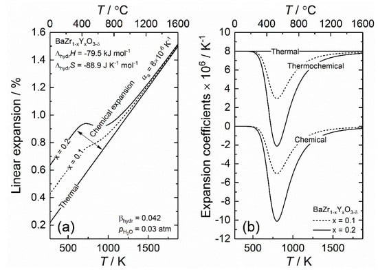 To model the thermochemical expansion upon hydration for BZY, a constant linear thermal expansion coefficient of 8 × 10−6 K−1 is used, which is in correspondence with the majority of values reported for acceptor doped BaZrO3 [77,80,118,119]. To account for the chemical expansion upon hydration, the proton and oxygen vacancy concentration is modelled based on standard hydration thermodynamics determined by Kreuer et al. on BaZr0.9Y0.1O3−δ; = −79.5 kJ mol−1 and = −88.9 J K−1 mol−1 [73], and these parameters are used for all BZY compositions. Note that is assumed to be constant and is only charge-compensated by protons and oxygen vacancies for this model, i.e., all other charge carriers are considered to have a negligible concentration. A constant linear chemical expansion coefficient upon hydration, , of 0.042 (volumetric coefficient of 0.125 divided by 3) is used based on work by Bjørheim et al. [83]. This value is generally consistent with other chemical expansion coefficients reported for BZY [77,78,80,82,84].