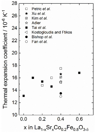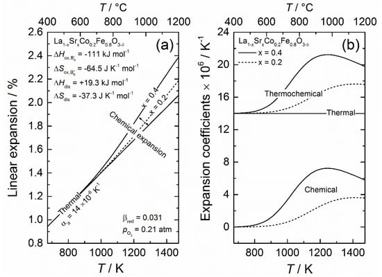 For chemical expansion coefficients upon reduction, the procedure is very similar (weight or lattice changes as a function of ), although it may require a more complicated defect chemical model due to the presence of one or more transition metals, which can be present in several oxidation states (see Section 2.2.2, where LSCF is treated as an example). The volume changes due to reduction are then related to changes in the oxygen nonstoichiometry, which can be determined by TG, coloumetric [106,107] or iodometric titration [107,108,109].