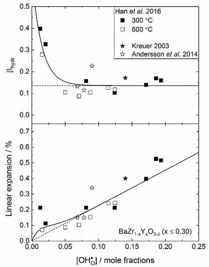 where and represent the chemical expansion coefficients for the defect associates and , respectively. Such defect associations will only affect the chemical expansion upon hydration if and/or differ significantly from the corresponding chemical expansion coefficients for the isolated proton and oxygen vacancy, and , respectively. Although there is little data available specifically addressing the effects of different dopants on , there appears to be a general tendency for the chemical expansion coefficient upon hydration to increase with increasing dopant size [83,85]. Furthermore, such defect associations may also impose a temperature dependence on , as experiments may be conducted under conditions where the oxygen vacancies and/or protons are partially associated to the acceptors. In such a case, a sample would exhibit an apparent chemical expansion coefficient upon hydration, varying from at lower temperatures, where all defects are associated, to at higher temperatures, where the protons and/or oxygen vacancies are completely unassociated. This also means that if and are distinctly different, then measurements conducted with different on the same sample will exhibit different volumetric expansions upon hydration. This can in other words be a source for small discrepancies in measured volume changes upon hydration.