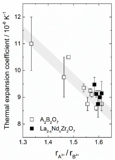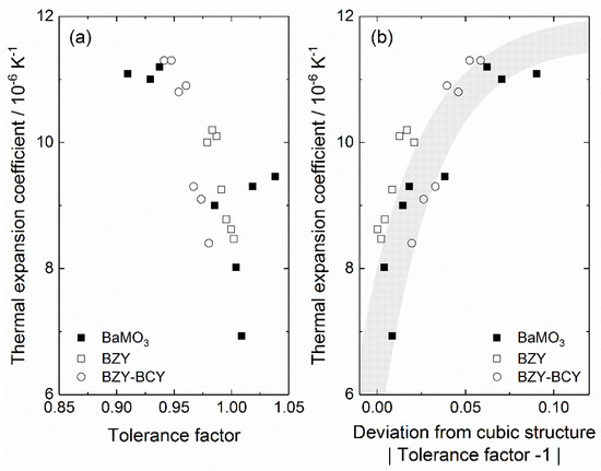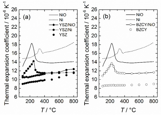 Several theoretical models have been proposed to predict the bulk thermal expansion coefficient of a composite material (some of which are described in detail in Section 4.2). This is useful to model the thermal expansion of certain electrode materials, requiring high ionic and electronic conductivity. For instance, for mixed protonic-electronic conduction, a cermet consisting of Ni and BaCe0.9−xZrxY0.1O3−δ—providing electronic and protonic conductivity, respectively—can typically be used in a proton ceramic electrochemical cell [7,8,10]. These models can also be applied to polycrystalline single-phase materials composed of anisotropic grains with random crystal orientations and thermal expansion coefficients. Similarly for textured ceramics, where one or more crystal directions are preferred, such models can be implemented to predict the thermal expansion coefficient. However, extrapolating values from thermal expansion coefficients of a crystal lattice is not necessarily trivial and some caution must be taken upon choosing the appropriate model and assumptions.