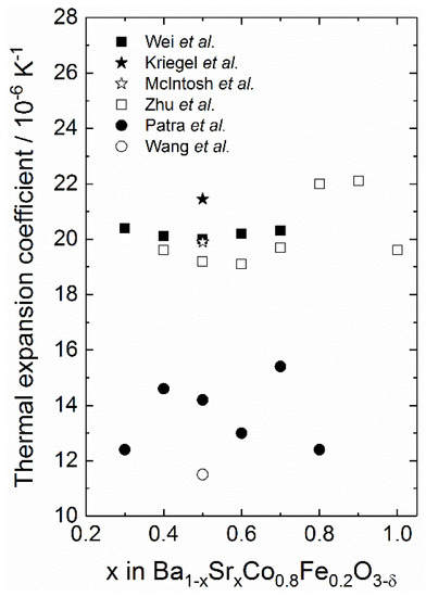 - Wei, B.; Lü, Z.; Huang, X.; Miao, J.; Sha, X.; Xin, X.; Su, W. Crystal structure, thermal expansion and electrical conductivity of perovskite oxides BaxSr1−xCo0.8Fe0.2O3−δ (0.3 ≤ x ≤ 0.7). J. Eur. Ceram. Soc. 2006, 26, 2827–2832. [Google Scholar] [CrossRef]