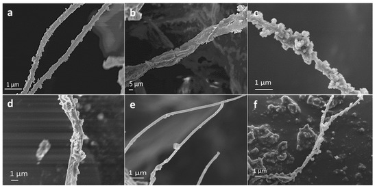 VPSEM micrographs of some selected mineralized fibrils of Table 1: (a) Col/Ap, (b) cithigh–Col/Ap, (c) citlow–Col/Ap, (d) Col/Ap–cithigh, (e) cithigh–Eu/Col/Ap, and (f) Eu/Col/Ap.