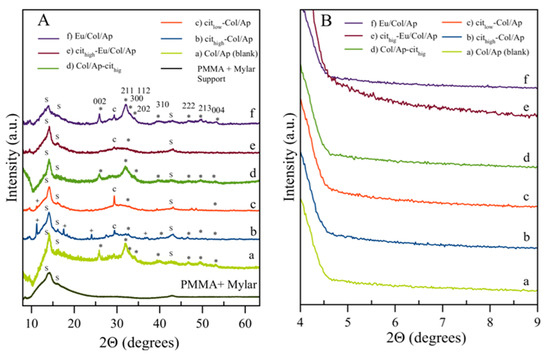 (A) X–ray diffraction patterns of mineralized type I collagen fibrils: a) Col/Ap, b) cithigh–Col/Ap, c) citlow–Col/Ap, d) Col/Ap–cithigh, e) cithigh–Eu/Col/Ap, and f) Eu/Col/Ap. The XRD pattern of the PMMA sample holder, whose characteristic reflections are denoted with S, is plotted at the bottom of the graph. (*) denotes the signals of the apatite phase, (c) denotes the signals of calcite and (+) denotes the signals of sodium citrate dihydrate residues. (B) Low angle XRD measurements of the samples a–f.