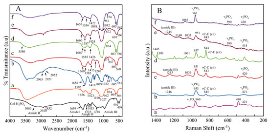 Additional characterizations were carried out analyzing the samples by FTIR and Raman microspectroscopy. The principal FTIR absorption bands of type I collagen fibrils assembled in 0.29 M H3PO4 are shown as reference in Figure 3A. This spectrum revealed the typical bands of amide B (~3065 cm–1, stretching C–H), I (~1658 cm–1, stretching C=O ), II (1535 cm–1, stretching C–N), and III (~1236 cm–1, C–N stretching and bending N–H) [37] which are associated with the triple helical conformation of type I collagen fibrils. The FTIR spectrum of this sample also exhibit bands at 1035 and 1080 cm−1, which arise from the C–O stretching and C–O–C stretching absorption modes of the carbohydrate moieties [38], a band at 2920 cm–1 which corresponds to C–H anti–symmetrical stretching, and a band at 1453 cm–1 which corresponds to the C=H stretching [36]. Additionally, two bands at 498 and 592 cm–1 are attributted to phosphate groups.