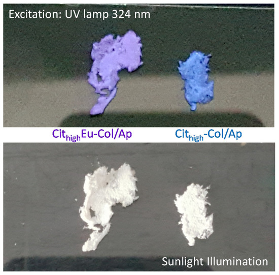 The luminescent emission of CithighEu–Col/Ap is very intense and it can be seen by naked eye. Figure 5 shows a picture of CithighEu–Col/Ap (left) and Cithigh–Col/Ap (right) materials under sunlight and UV–light (324 nm) illuminations. Under sunlight (Figure 5, down) both materials shows a white color. Under UV illumination (Figure 5, up) Cithigh–Col/Ap shows a blue color while CithighEu–Col/Ap is purple. It is due to the fluorescence emission of both materials; Cithigh–Col/Ap shows the blue fluorescence emission of the collagen (490 nm) and CithighEu–Col/Ap shows the same blue emission as well as the red emission (614 nm) of the Eu3+, resulting in a purple color. It has to bear in mind that this picture shows fluorescence emission (td = 0µs) while Figure 4 shows sensitized fluorescence (td = 120 µs) and for this reason the intensity of the blue emission of the collagen in Figure 4 is very low. However, it can be seen by naked eyes in this picture.