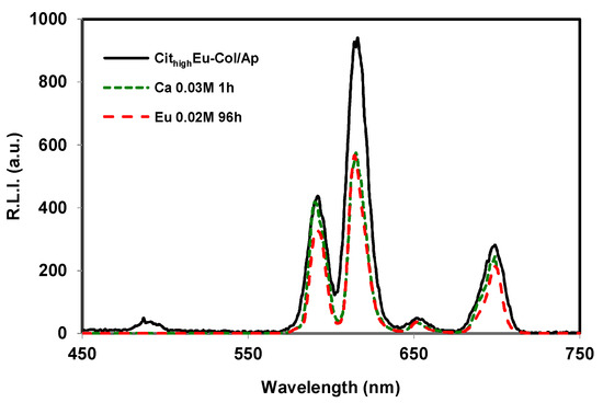 Figure 6 compares the luminescent properties of CithighEu–Col/Ap with those of citrate–coated Eu3+–doped carbonated apatite nanoparticles (13.3 ± 2.6 wt % Eu) obtained in a previous work [26] and citrate–coated Ca2+–doped EuPO4.H2O (43.7 ± 0.3 wt % Eu, 4.9 ± 0.1 wt % Ca) nanoparticles prepared recently in our laboratory. It is possible to conclude that the luminescence properties of all of them are practically the same, varying only in the emission at 490 nm because the particles did not contain collagen. The R.L.I. cannot be compared because the spectra were recorded with different instrumental conditions due to the differences in the luminescence quantum yields.
