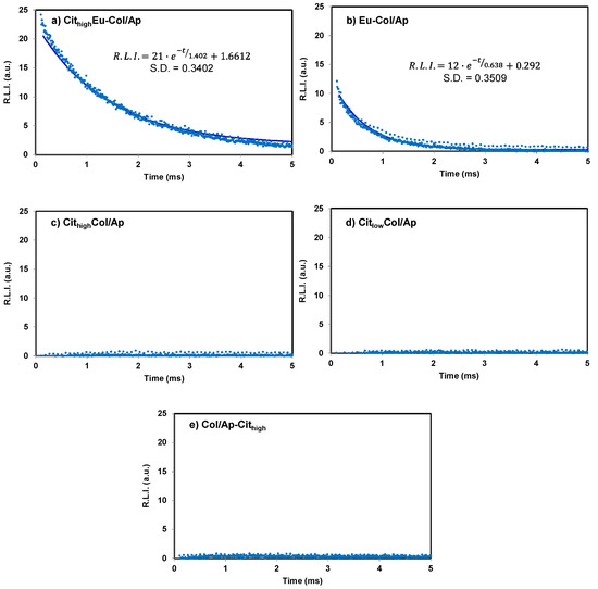 Luminescence decay curve of the different Eu–doped apatite mineralized collagen fibrils, i.e. (a) cithigh–Col/Ap, (b) Eu-Col/Ap, (c) cithigh–Col/Ap, (d) citlow–Col/Ap, and (e) Col/Ap–cithighλexc/em = 240/614 nm, slit–widthsexc/em = 10/0 nm, and detector voltage = 600 V. Circles correspond to experimental data and lines to the fitting equation.