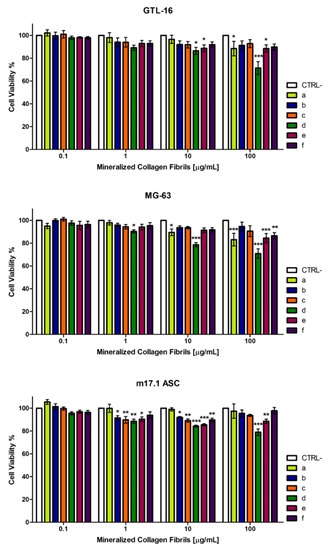 Cytocompatibility of the different Eu–doped and citrate–coated apatite mineralized collagen fibrils. GTL–16, MG–63 and m17.ASC cells were incubated with the different types of fibrils (a, Col/Ap; b, cithigh–Col/Ap; c, citlow–Col/Ap; d, Col/Ap–cithigh; e, cithigh–Eu/Col/Ap; f, Eu/Col/Ap) for three days and their viability was assessed in MTT assays. Data represent means ± sd of three independent experiments performed in triplicates and statistical analyses were carried on using One–way ANOVA, with Bonferroni comparison test. For statistical analysis all data were compared to untreated samples (*p < 0.05, **p < 0.01, ***p < 0.001).