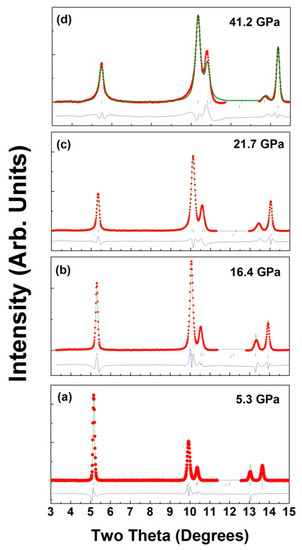 Figure 6a–d show the representative fitted XRD patterns at 5.3, 16.4, 21.7, and 41.2 GPa, respectively.