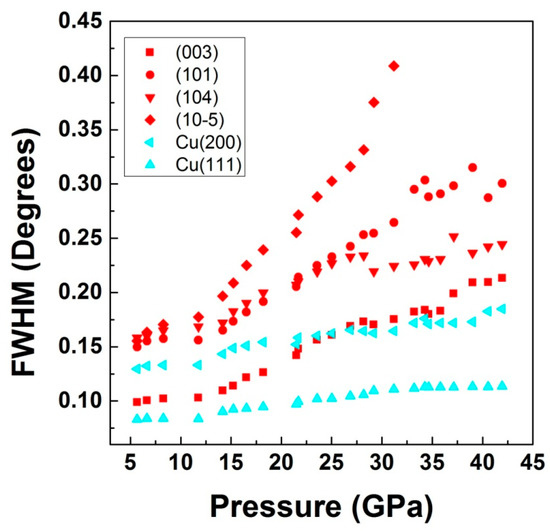 Full-width at half maxima (FWHM) of various diffraction peaks from the sample along with peaks from the pressure calibrant (Cu).