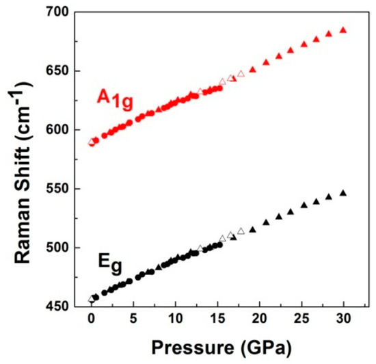 The two independent experiments give consistent results, as can be seen in Figure 12, which shows the pressure dependence of two Raman mode frequencies, which can be expressed as