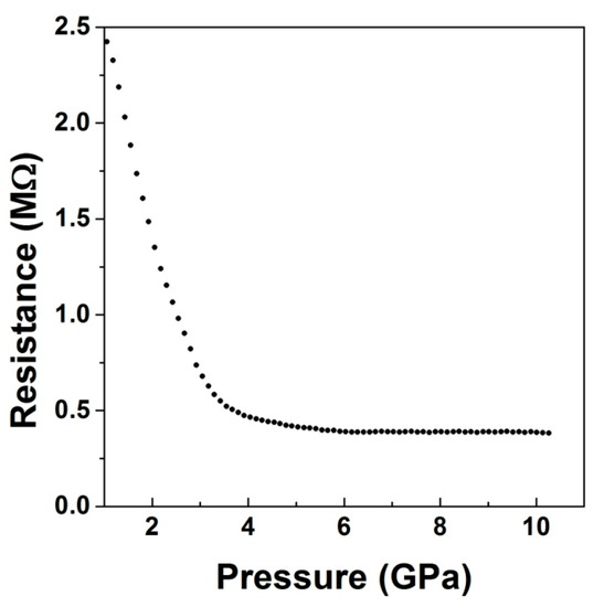 The initial fall of the resistance up to 3 GPa is typical of measurements in the Bridgman press. Such a phenomenon is usually due to the improvement of the ohmic contact formation between the leads and the sample in the initial stage of compression. On the other hand, the behavior of the resistance beyond 3 GPa corresponds to the intrinsic semiconducting behavior of the sample, which shows a monotonic decrease in the resistance, followed by almost a constant value beyond 4 GPa. This kind of behavior indicates no major pressure-induced changes in the electronic structure of the sample [57]. The behavior of the resistance with pressure therefore confirms that there are no major changes in the electronic structure of LiCrO2 up to 10 GPa.