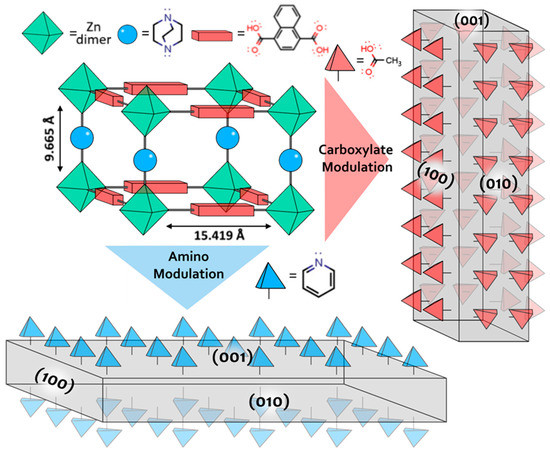 Recent studies have shown that these gas adsorption capabilities can be further enhanced through the introduction of modulators during MOF synthesis, by altering the overall crystal growth process [14]. In anisotropic MOFs, such as those in the M2(dicarboxylate)2(N-ligand) series, the modulator-based growth control is dramatic and can significantly alter crystal aspect ratios [15,16,17]. The introduction of modulators during synthesis can target either the carboxylate (h00, 0k0) or the amino (00l) planes, inhibiting crystal growth along these planes and directing MOF crystal growth along unmodulated axes (Figure 1) [15,16,17]. Previous work has demonstrated the [Cu2(NDC)2(DABCO)]n (NDC = 1,4-naphthalene dicarboxylate; DABCO = 1,4-diazabicyclo[2.2.2]-octane) member of the [M2(dicarboxylate)2(N-ligand)]n MOF series can be modulated to obtain rod or plate morphologies with the use of acetic acid (carboxylate) or pyridine (amino) modulators [18].