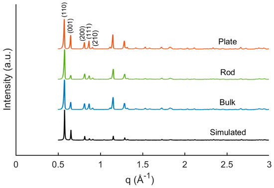 As previously mentioned, powder XRD scans show slight preferential orientation likely due to morphology influencing packing [24]. Drop cast films have a measurable degree of orientation compared to an isotropic film. The rod and bulk morphologies show preferential orientation for the (100) and (010) to be parallel to the substrate, which is enhanced by solution shearing and drop casting the particle suspensions. The observed orientation is expected for the rod morphology, as the major surfaces are defined by the (100) and (010) plane and are expected to lay flat with the substrate due to shear alignment forces during convective deposition processes [43]. Furthermore, this result agrees with other convective deposition techniques used to orient rod-like particles [43]. It should be noted the (001) peak was not observed on the diffraction patterns for solution sheared rods. To quantify the orientation, we took the standard deviation of the signal noise as the maximum possible peak value for the (001) (Table 5). As previously mentioned, the bulk material gave a lower aspect ratio, rod-like morphology, which is likely why preferential orientation similar to the higher aspect ratio rods is observed.
