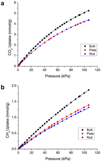 Adsorption isotherms for bulk, plate and rod morphologies of [Zn2(NDC)2(DABCO)]n at 273 K for (a) CO2 and (b) CH4.