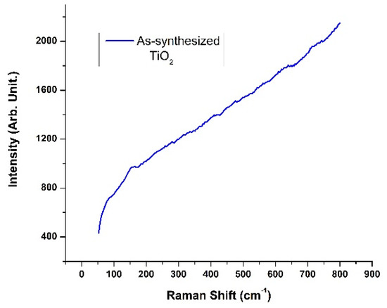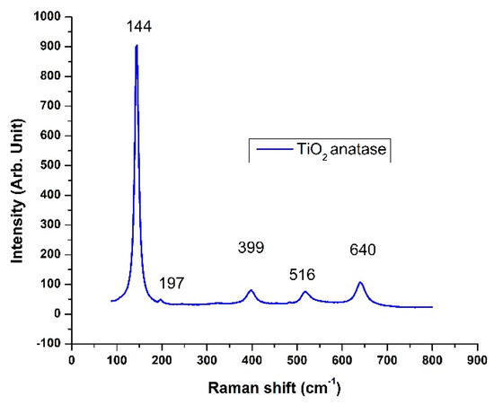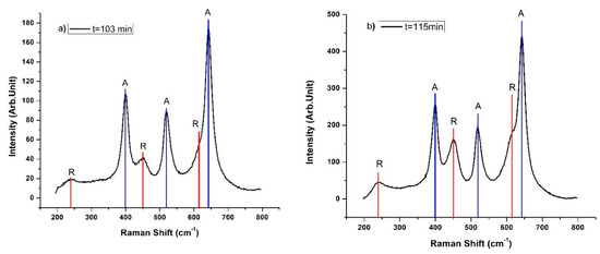 Figure 2 shows the Raman spectrum of the powders annealed at 250 °C for 2 h in an ambient atmosphere. The bands observed at 144, 197, 399, 516, and 640 cm−1 correspond to the anatase phase of TiO2 [30]. The Raman spectra of TiO2 powders annealed at 475 °C for 103 and 115 min are shown in Figure 3a,b. Besides, there are other bands at 236, 447, and 613 cm−1 that correspond to the rutile phase of TiO2 [30]. The coexistence of anatase and rutile can be observed in the Raman spectra of both samples. However, according to the little increase in the peak intensities of rutile from Figure 3a,b, the change in the annealing time from 103 to 115 min promotes a partial transformation from anatase to rutile. In a previous work [30], a methodology was proposed to calculate the phase content of anatase/rutile, using the signal intensities for anatase (399 cm−1) and rutile (447 cm−1). Some samples were measured by using X-ray diffraction (XRD), and the method proposed by Spurr and Myers [31] was applied in order to determine the anatase and rutile contents. The results obtained with both methods were compared, and a slight difference of approximately 4–6% was found. This difference can be assigned to the very nature of each technique. Moreover, the values obtained were very close, and they presented the same trend. The phase content calculations were made as follows: