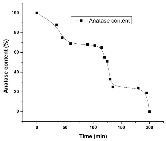 Many methods can be used for synthesizing TiO2, usually by obtaining anatase or an amorphous phase (which can be crystallized into an anatase phase by thermal treatment). This can be explained from two different perspectives, structurally and thermodynamically. In the former, this occurs due to the great ease by which anatase forms octahedral TiO6 arrangements in the short range, which then adjust into a long-range anatase structure. This probably occurs because the molecular construction of anatase is less restrictive than that for rutile [19,20]. In the latter, there is a faster rate of crystallization in anatase that may be caused by its lower surface free energy, in contrast with the higher surface free energy of rutile [21,22,23]. It is important to understand the transformation kinetics of anatase to rutile. Obtaining different phases of TiO2 depends on several factors, such as the particle size, synthesis method, heating rate, etc. All of these factors have a direct effect on the final product. The kinetic transformation of anatase–rutile is usually expressed in terms of time and temperature. It must be borne in mind that the anatase–rutile transformation is not instantaneous, and it depends on time, because it is a reconstructive transformation. Bulk anatase begins to transform irreversibly at around 600 °C, even though temperatures ranging from 400 to 1200 °C have been reported, depending on the synthesis method and the precursors [24,25,26,27].