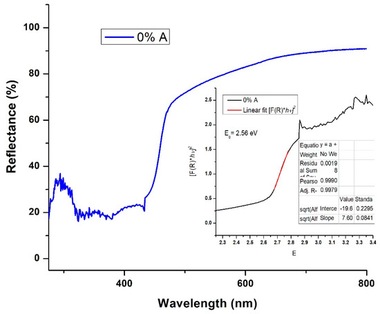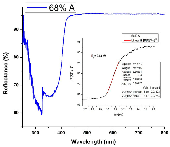 The visible photo-response of all samples were checked by DRS. The spectra shown in Figure 5 and Figure 6 belong to two samples containing 68%A and 0%A, respectively. They were treated with the Kubelka–Munk model in order to obtain the optical bandgap of the material, with the well-known Equation: