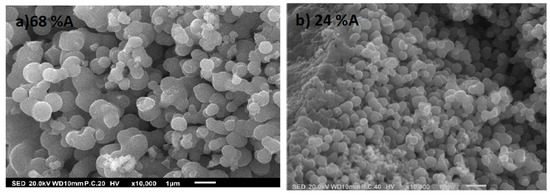 Figure 7 is a representative image of the amorphous TiO2 powders synthesized by sol-gel. As can be seen, there is no trend in morphology, and only irregular agglomerates with different sizes were found. Figure 8 shows the SEM images corresponding to two samples of TiO2 powders with mixed anatase/rutile phases, containing 68% anatase and 32% rutile (Figure 8a), and 24% anatase and 76% rutile (Figure 8b). The morphology is observed to be composed by spherical TiO2 particles with uniform sizes. Such a morphology was also found for other anatase/rutile ratios.